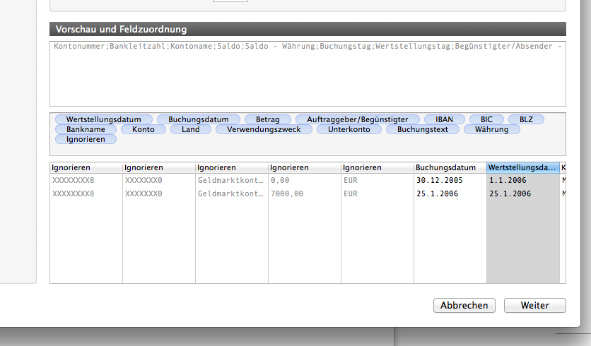 Die Zuordnung erfolgt durch Ziehen der Tags auf die jeweilige Spalte in der Vorschau. Die Anzeige wird sofort aktualisiert, sodass man gleich sehen kann, ob die Zuordnung korrekt war.