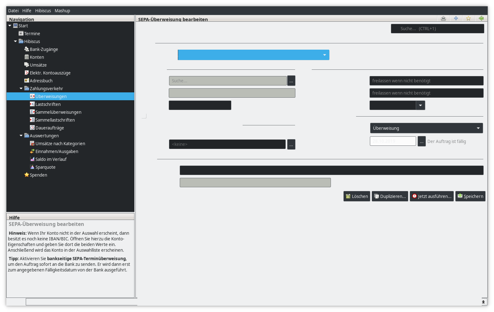 Wenn ich auf das helle Thema umschalte und die Sitzung neu starte kann ich wieder lesen was ich wo eingebe. Andere Java-Programme funktionieren mit dem Theme, sodass ich denke das Problem ist hibiscus-spezifisch.