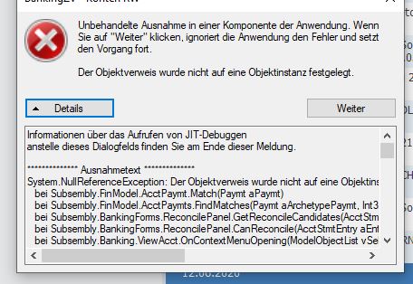 habe den Stacktrace etwas nachvollzogen. Es könnte irgendwie mit dem Verwendungszweck der Sammelbuchung zusammenhängen. Ist der etwa komplett leer?