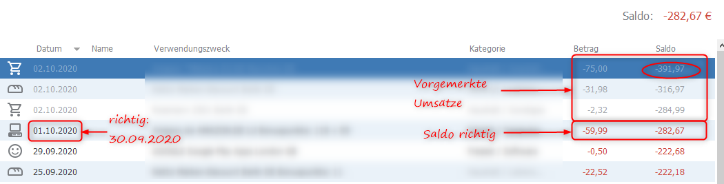 Dabei ist mir aufgefallen, dass das Buchungsdatum der letzten Zahlung statt 30.09.2020 als 01.10.2020 angezeigt wird.