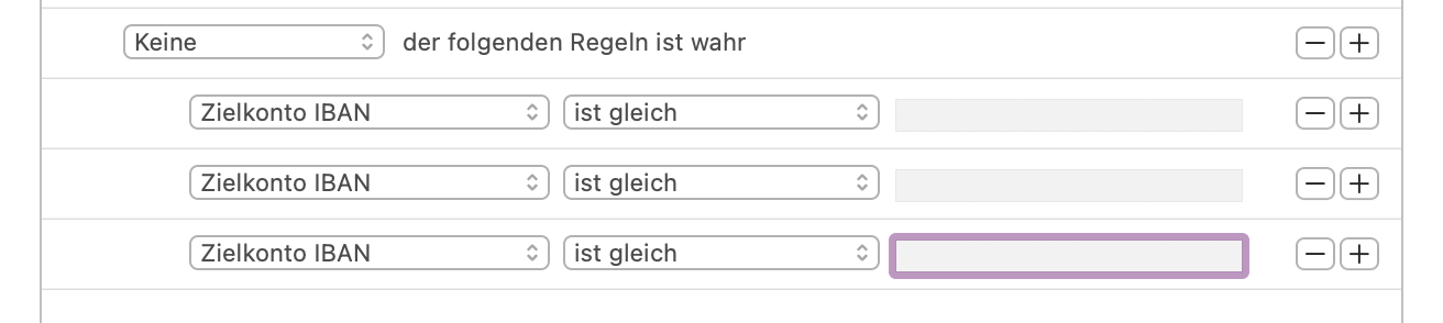 Wenn ich nun Regeln definieren könnte, die zuerst feststellen „Dies ist eine Buchung auf dem Firmenkonto, daher geht die Transaktion in die Kategorie "extern Firma"“, wäre alles fein.