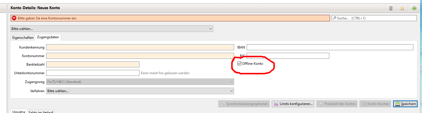 Mir erschließt sich zwar nicht, warum sich das Offline-Konto bei dir nicht einfach anlegen ließ - bei mir geht das problemlos. Aber Hauptsache, das Problem ist gelöst.