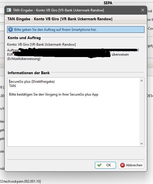 Bei Durchführung einer Überweisung aber, ist zuerst die Konto-Legimitäts-Bestätigung und danach die Bestätigung der Überweisung notwendig.