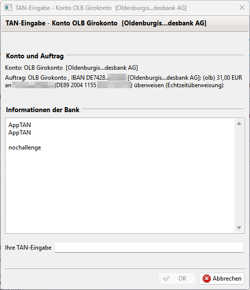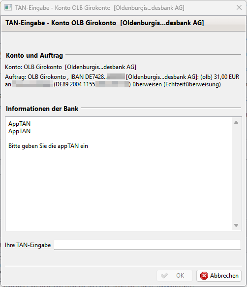 Mit TAN-Eingabe, bei der OLB appTAN genannt. Ich schrieb ja, es poppen 2 Eingabefenster nacheinander auf: Das oben gezeigte und dann das richtige. Und die TAN wird erst generiert, wenn ich beim ersten Fenster "irgendwas" eingegeben und mit OK bestätigt habe. Und diese TAN gebe ich dann, natürlich korrekt, ins zweite Fenster ein: