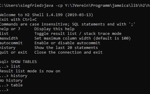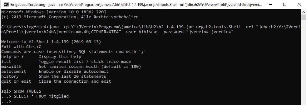 java -cp Y:\JVerein\Programm\jameica\lib\h2\h2-1.4.199.jar org.h2.tools.Shell -url "jdbc:h2:Y:\JVerein\Profil\hibiscus\h2db\hibiskus;CIPHER=XTEA" -user hibiscus -password "P@ss0rd= P@ss0rd="