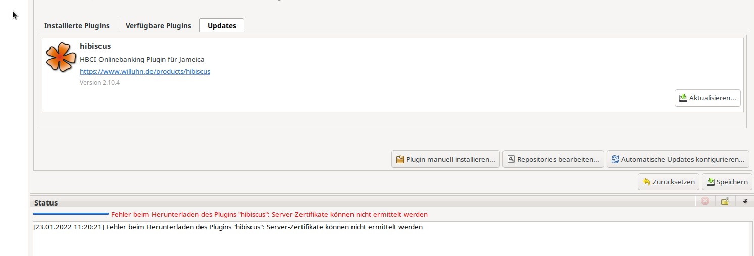 Ich denke, deine Java-Version ist das Problem. Die kann das SSL-Zertifikat von willuhn.de nicht prüfen. Gib in einem Terminal mal "java -version" ein. Was wird da ausgegeben?