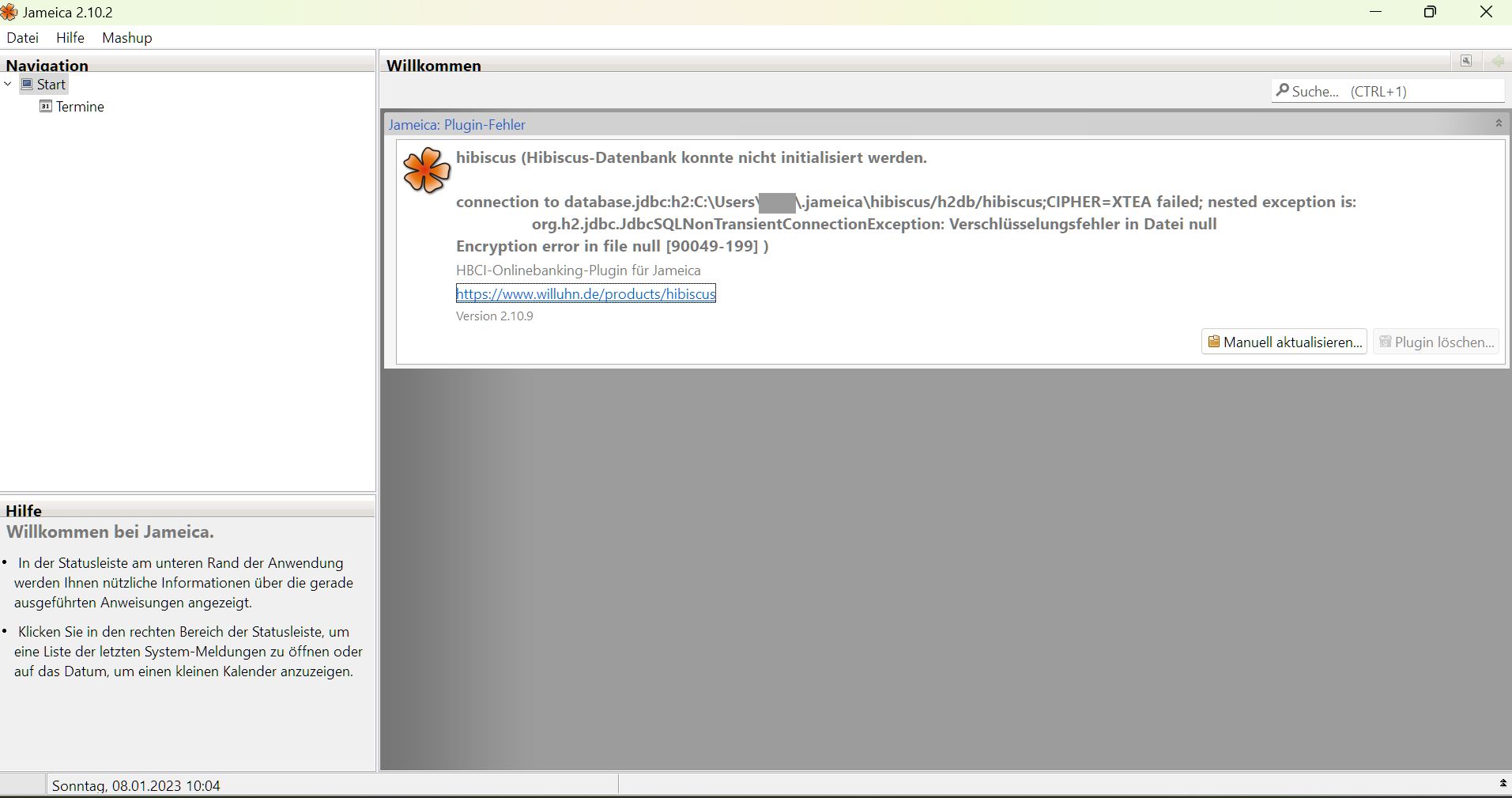 Ich wollte heute erstmals Hibiscus installieren (Windows 11). Im Programm wird mir aber stets eine Fehlermeldung (s.u.) angezeigt. Auch die Installation der alten Plugin-Version 2.10.8 bzw. manuelles Download und manuelle Installation des Plugins ändert nichts. Hat jemand eine Idee hinsichtlich der Ursache? Danke.