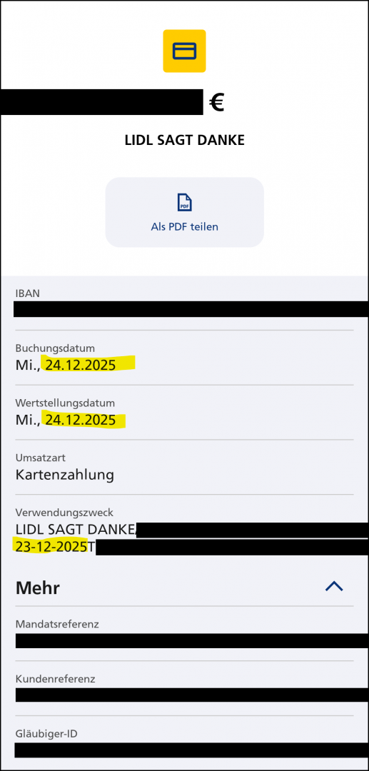 Ich habe hier z.B. eine Kartenzahlung vom 23.12.2025. Kartenzahlungen werden bei der Postbank immer am nächsten Bankarbeitstag gebucht und wertgestellt. Eine Kartenzahlung am Freitag, Samstag oder Sonntag wird also erst montags gebucht und wertgestellt. (Das weißt du sicher, aber ich schreibe es trotzdem, damit auch andere Personen, die z.B. schon mit der Umbuchung von ihrem DKB-Tagesgeldkonto vollständig überfordert wirken, uns folgen können.)
